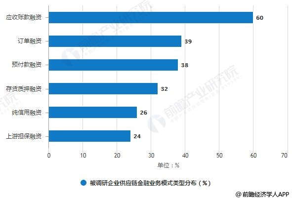 从业务模式类型看,应收账款融资业务比例最高。据中国人民大学中国供应链战略管理研究中心调研数据显示,2018年有60%的供应链金融服务企业开展了应收账款融资;其次为订单融资,开展比例为39%;预付款融资开展比例为38%;此外,有32%的企业开展了存货质押融资;26%的企业开展了纯信用贷款融资业务;而依托核心企业开展的上游担保融资业务比例为24%。