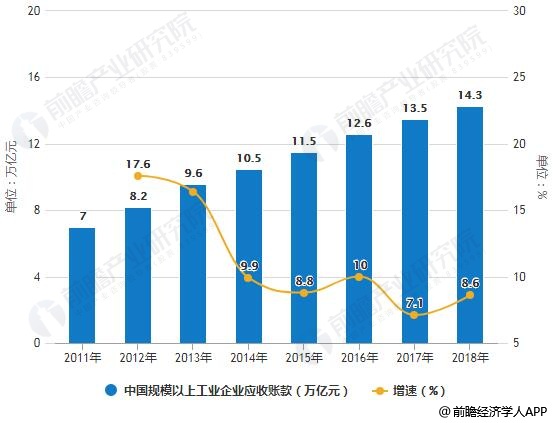 2011-2018年中国规模以上工业企业应收账款统计及增长情况