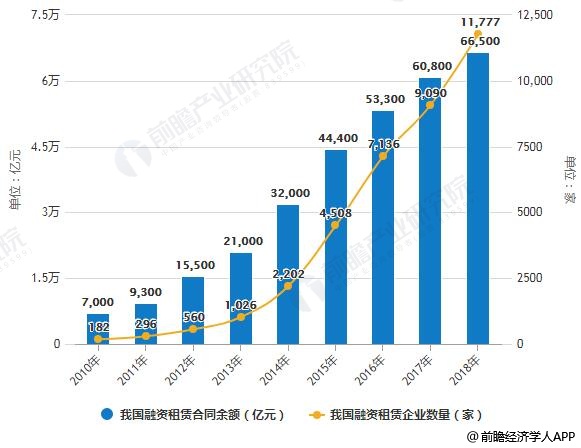 除了应收账款以及产成品存货以外,融资租赁与供应链金融同样紧密相连。近十余年来,我国融资租赁业经历了快速发展,从2007年到2018年,融资租赁公司数量由2007年不足200家增加到目前的11777家,增长了50多倍。截止至2018年底,业务总量,即融资租赁合同余额,约为66500亿元人民币,比2017年底的60800亿元增加约5700亿元,增长9.38%%。