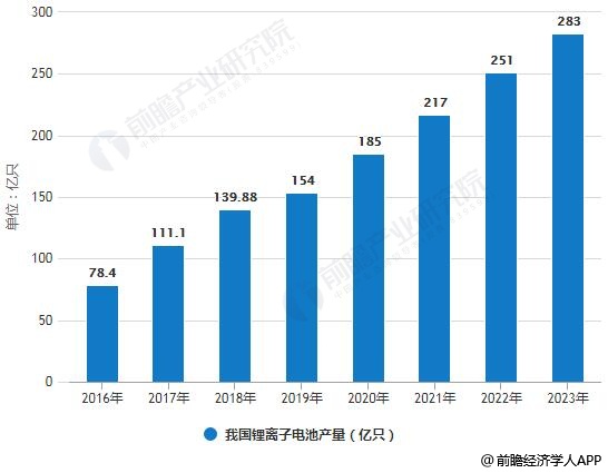 2016年中国锂离子电池产量为78.4亿只,同比增长35.8%。到了2017年中国锂离子电池产量增长至111.1亿只,同比增长31.3%。截止至2018年12月,我国锂离子电池产量为137470.9万只,同比增长16.1%,较上月增加18490.8万只。2018年1-12月我国锂离子电池产量累计1398713.9万只,较去年同期增长12.9%。预测2019年我国锂离子电池产量将达到154亿只,未来五年(2019-2023)年均复合增长率约为16.43%,并预测在2023年我国锂离子电池产量将达到283亿只。