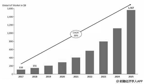 2017-2025年全球物联网市场规模统计情况及预测(单位:十亿美元)