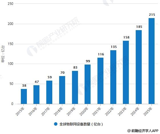 2015-2025年全球物联网设备数量统计情况及预测