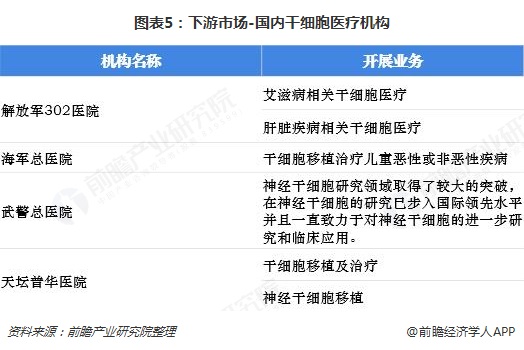 在行业下游应用领域,主要是由开展干细胞治疗的机构组成,以体系三甲医院为主。国内比较成熟的干细胞医疗机构有解放军302医院、海军总医院、武警总医院和天坛普华医院。