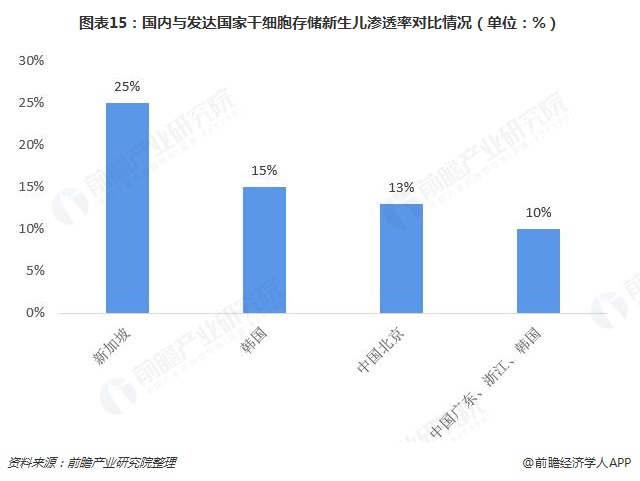 干细胞产业链上游的采集与存储业务相对来说技术要求较低,目前发展较好。由于我国人口基数大,在国际上已成为干细胞存储的主要国家,但与发达国家的干细胞存储新生儿渗透率相差较远。随着干细胞治疗适应症以及临床的不断发展,将不断加深对干细胞临床治疗和存储的重视程度,在2019年及未来,我国干细胞存储还有很大的成长空间。