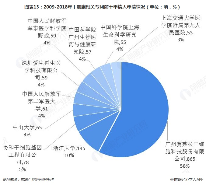 具体从申请人来看,截至2018年10月,干细胞相关专利前十申请人共计申请1497项专利,其中,广州赛莱拉干细胞科技股份有限公司总计申请数量最多,达到865项,在前十中占比高达57.8%;浙江大学为例申请榜第二,共计申请干细胞相关专利145项,协和干细胞基因工程有限公司在申请数量上排名第三,共计申请78项。广州赛莱拉干细胞科技股份有限公司在干细胞技术研发方面一家独大,形成强大的产品竞争技术壁垒。