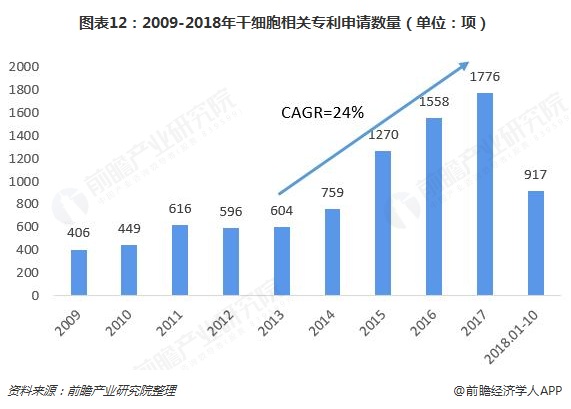 从国内来看,截至2018年10月,以“干细胞”做关键词搜索,可以看到2009-2018年申请专利数量逐年递增。2009-2013年,干细胞申请专利数量平稳发展。从2014年开始逐渐迎来爆发。2017年达到1776项。2013-2017年五年间年复合增长24%。