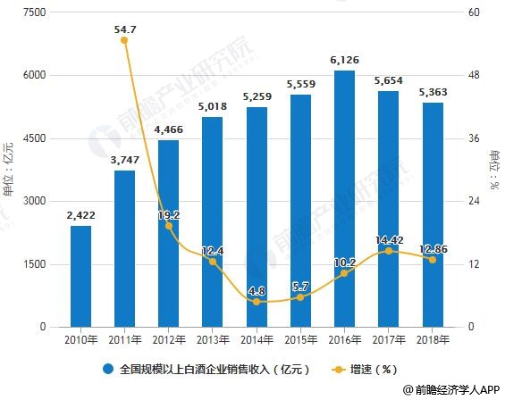 据前瞻产业研究院发布的《中国白酒行业市场需求与投资战略规划分析报告》统计数据显示,2017年1-12月,纳入到国家统计局范畴的规模以上白酒企业1593家,累计完成销售收入5654.42亿元,与上年同期相比增长14.42%,累计实现利润总额1028.48亿元,与上年同期相比增长35.79%。到了2018年底,全国规模以上白酒企业累计实现销售收入5363亿元,比上年同期增长12.86 %,累计实现利润总额1250亿元,比上年同期增长29 .98%。