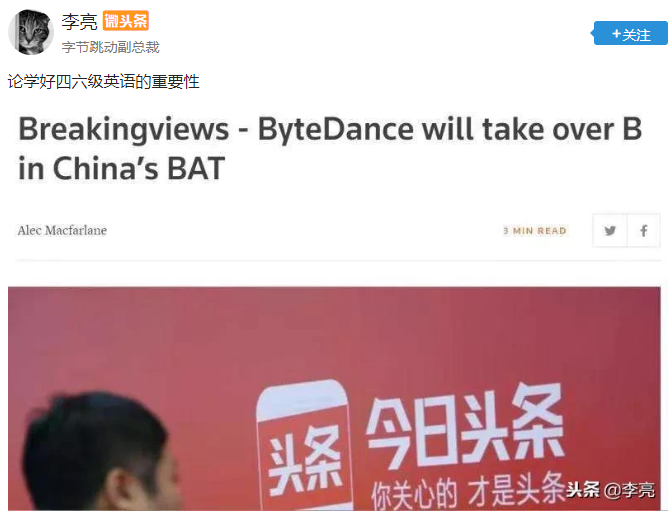 但这篇观点文章却不少人曲解为二者将要合并。百度公关部相关负责人在朋友圈回应称:“百度暂不考虑收购字节跳动。”而字节跳动的回应则更火爆,公司副总裁李亮在微头条贴出路透文章标题截图并配文:“论学好四六级英语的重要性”。
