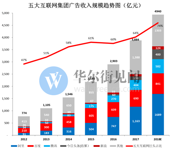 据华尔街见闻见智研究,2012年起,在移动互联网红利的推动下,网络广告市场高速成长,2017年网络广告总收入达到3884亿元,规模翻了5倍。