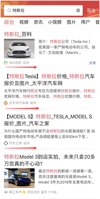试用今日头条搜索功能可以发现,结果中除了今日头条站内的内容外,还包括了文字、视频、图片等站外内容,涉及百科、官网、App Store下载等,且有明确“站外”标识。