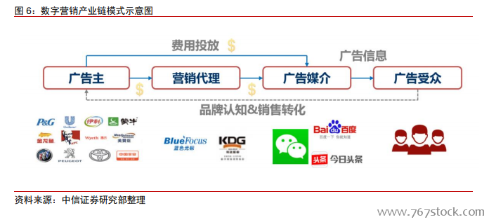 广告产业链:广告产业链主要参与方包括广告主、营销代理/中介、广告媒介/媒体。广告媒介是广告资源的提供者,互联网广告媒介一般是各类汇聚用户注意力的 APP(如微信、微博、头条),广告主通过广告媒介将产品等信息触达到广告受众。而营销代理/中介为广告媒体和广告主提供广告相关的专业中介运营服务(如市场调研、广告策略、广告创作、媒介计划、媒体采购、媒介执行等),其核心价值包括批量采购媒体资源的规模优势、提供专业化投放与监测服务以及隔离操作风险等。
