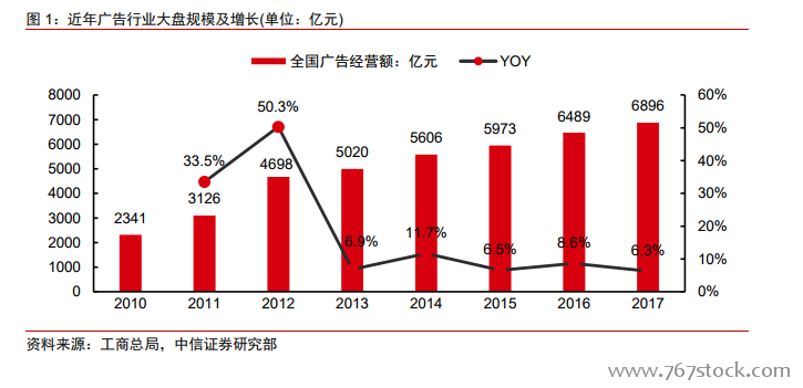 驱动:互联网迅速普及叠加广告技术逐步完善,驱动互联网广告市场规模高速增长。随着智能终端的普及(截至 2017 年 12 月中国互联网人口达 7.72 亿,普及率为 55.8%,已覆盖全国主流消费人群,CNNIC),触网渗透率逐步提升,单用户时长持续增长(单用户日使用时长达到近 5 小时,QuestMobile),互联网广告市场在过去 8 年增长了超过 10倍,从 2010 年的 337 亿增长至 2017 年的 3884 亿,并且增速始终保持在 30%以上。而中国主要的互联网平台公司不同程度的依靠 to B 的广告收入变现,包括电商、搜索引擎、新闻资讯、在线视频、社交网络等,各类互联网平台大爆发带动的用户注意力增长以及精准化、本地化等营销技术的完善驱动互联网广告快速增长。随着网民人口渗透趋缓以及时长见顶,我们认为未来行业增长将更加依赖广告模式的创新以及技术驱动。