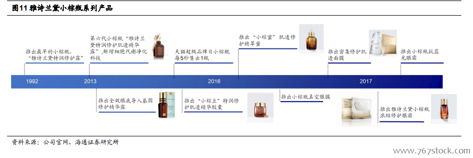 围绕小棕瓶,公司研发出新的产品线,并不断推出新产品。2016 年推出密集修护肌透面膜,内层使用小棕瓶精华,外层使用银箔外膜,主打高端技术、快速修复的功能。2017 年 6 月,推出雅诗兰黛小棕瓶浓缩修护眼霜,巩固了雅诗兰黛在眼部护理细分领域的领导者地位。目前小棕瓶系列已经包括面膜、眼霜、眼膜、精华、精萃蜜、精华胶囊等多种产品形式,满足消费者护肤的细分需求。