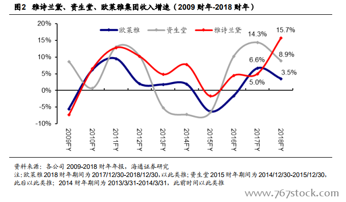 注重产品的研发与创新。2018 财年雅诗兰黛研发费用 1.8 亿美元,占集团总收入的1.3%,2012-2018 财年的费用率稳定在 1-2%之间。目前雅诗兰黛集团在全球有 800 多名研发人员,在美国、加拿大和中国等地设有技术性研发中心并在韩国、美国等地设有潮流性研发中心。研发投入为集团带来了较高的回报,2016 财年,约 24%的全球销售收入来自于新产品。