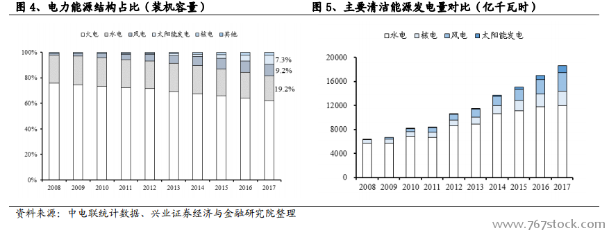 水电综合优势显著,政策多维度引导解决“弃水”问题。水电综合优势显著。2014 年 6 月,国务院印发《能源发展战略行动计划(2014-2020年)》(简称《行动计划》),要求到 2020 年,一次能源消费总量控制在 48 亿吨标准煤左右,煤炭消费总量控制在 42 亿吨左右。随着国家能源结构的调整,近 10年来火电装机容量逐步下滑(下降 14pct),取而代之的是各类清洁能源。诸多清洁能源中水电装机容量居于首位(占总装机量 20%左右)。与光伏、风电等清洁能源相比,水力发电存在两大优势:一是上网价格低廉,成本方面更具竞争力,二是稳定性更强,平均利用小时数更高(风能和光能波动更大),因此尽管光伏发电和风电合计装机量接近水电,但实际发电量仅为水电的三分之一。