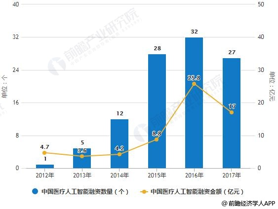 2012-2017年中国医疗人工智能融资数量及金额统计情况