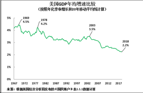 要弄清美国当前所处的经济周期阶段,就有必要明白,美国经济的主要特征是长期放缓。如图2所示,以能消除短期经济周期波动影响的20年移动平均线计算,美国GDP年均增速从1969年的4.5% ,降至1978年的4.2%,2003年的 3.5%,2018年的2.2%。