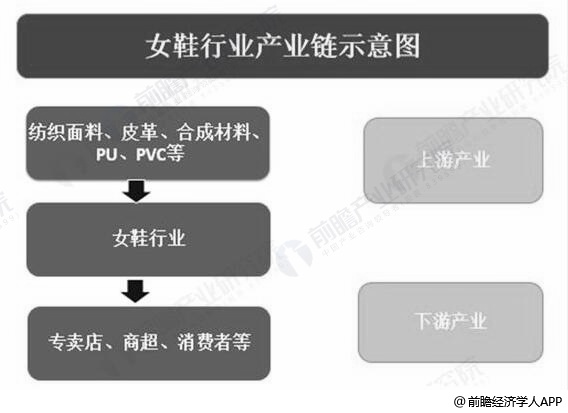 女鞋制造业的上游行业是纺织面料、皮革、合成材料及橡胶、PU、PVC等。上下游产品关联度高,女鞋制造业的发展带动了上游多个行业的发展。上游供应链各行业的价格变动与女鞋行业紧密相关,上游原材料的成本一旦上升就会带动女鞋行业的成本上升,不论是进出口还是材料价格的变动,都会一定程度上影响女鞋行业的发展。皮革、橡胶、面料、以及塑料凳原材料的产量变动在社会上形成的供需不平衡状况会整体上影响女鞋行业。女鞋下游行业是女鞋零售行业,零售业的发展和居民的消费支出等都将带动女鞋消费和生产。