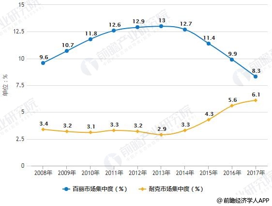 2008-2017年中国运动女鞋、时尚女鞋市场集中度对比情况(以百丽、耐克为例)