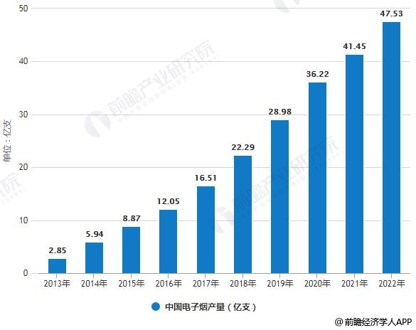确实,“时髦前卫”“替代卷烟”是时下众多年轻人追捧电子烟的理由,已有越来越多的人加入到吸食电子烟的“大军”。据前瞻产业研究院发布的《中国新型烟草制品行业市场需求预测与投资战略规划分析报告》统计数据显示,中国是电子烟的最大生产地,中国出口的电子烟占世界总产量的90%以上,电子烟的生产制造已经形成成熟的产业链体系,行业前景广阔。虽然我国制造了全球90%以上的电子烟,但国内消费市场依然较小,仅有6%的产品销于国内,然而欧美市场占据了出口份额的83.7%。2016年中国电子烟产量为12.05亿支,截止至2017年中国电子烟产量增长至16.51亿支,初步测算2018年中国电子烟产量达到了22.29亿支左右,预测2019年中国电子烟产量将达到28.98亿支,我国电子烟市场仅占烟草行业的0.23%。并预测至2022年中国电子烟产量将达到47.53亿支。