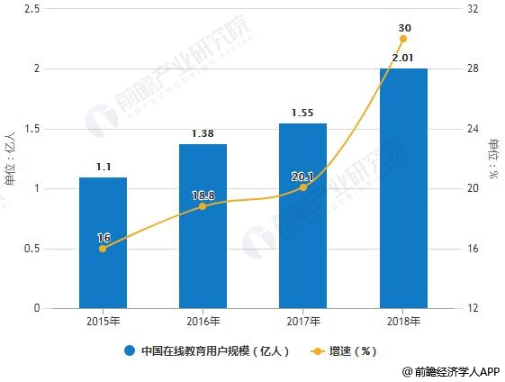 据前瞻产业研究院发布的《中国在线教育行业市场前瞻与投资战略规划分析报告》统计数据显示,2015年中国在线教育用户规模已达11014万人,同比增长16%。到了2016年中国在线教育用户规模达到了13764万人,同比2015年增长了18.8%。2017年中国在线教育用户规模增长至15518万人,同比增长20.1%。截止至截至2018年12月,中国在线教育用户规模已达到2.01亿人,较2017年底增加4600多万。在线教育用户规模年增长率近30%,位居各领域前列,与此同时,手机在线教育课程的用户规模年增长率更是突破60%。有越来越多的用户借助互联网享受到了优质的教育资源。