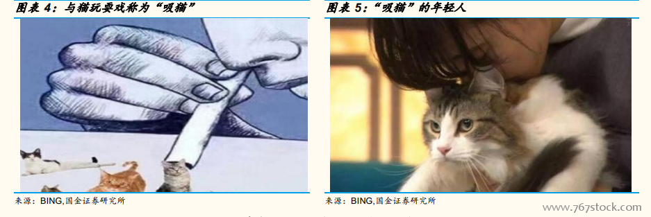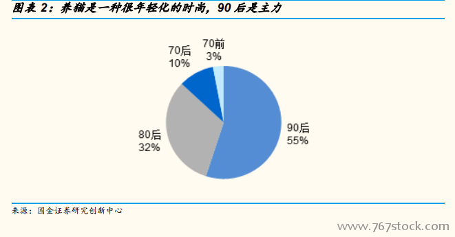 “吸猫”是一种年轻人的新时尚,80&90 后为猫消费的主力。正如我们上文所述,千禧一代和 Z 世代的人群,孤独感更强,更需要陪伴,单身贵族更多,更愿意为自己喜欢的事物消费,而宠物完美契合了他们的需求,“为宠物消费”成为了一种年轻人的新时尚,“吸猫”群体(或者更具体点说,为宠物花钱的群体)呈现非常年轻化的趋势。国金证券研究创新中心对线上消费的情况进行了大数据监测,监测数据显示,从 “猫相关用品”的消费者的用户画像来看,养猫群体(或者说为猫消费的养猫群体)中 55%是90 后,32%是 80 后,80 前仅占比 13%。“吸猫”是一种年轻人的新时尚,“吸猫”的主力是 20-29 岁的年轻人,随着这一代年轻人逐渐成长成为社会的中坚消费力量,对于宠物的消费力也有望持续增长,“萌宠经济”有望迎来新的发展。