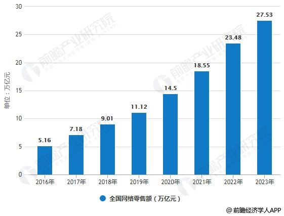 2017年全国网络零售额增长至71751亿元,较2016年的51556亿元,同比增长39.17%。截止至2018年底,全国网络零售额达到了90065亿元,比上年增长23.9%。预测2019年全国网络零售额将突破10万亿元,达到11.12万亿元,未来五年(2019-2023)年均复合增长率约为25.44%,并预测在2023年全国网络零售额将达到27.53万亿元左右。