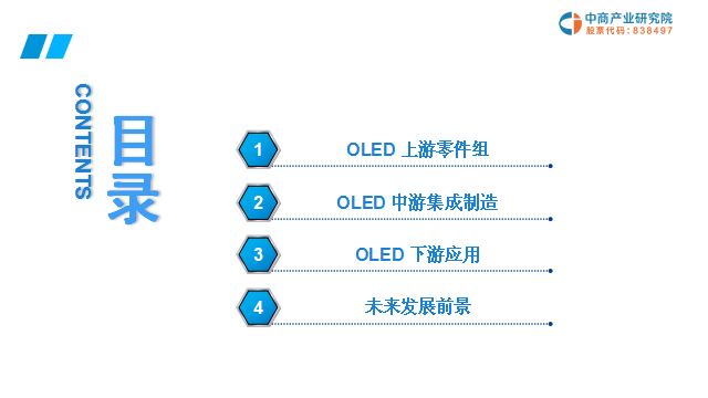 PART1上游零件组汇总了制造设备、制造材料、组装零件三个方面的产业企业,共11页,含150多家企业。PART2中游集成制造汇总了显示屏、触摸屏、盖板三个方面的产业企业,共5页,含70多家企业。PART3下游应用汇总了整个下游应用的产业企业,共9页,含190多家企业。PART4未来发展前景剖析了OLED的优势、促进因素及市场需求预测。