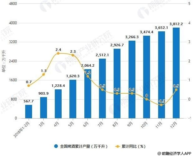 2018年1-12月全国啤酒产量统计及增长情况