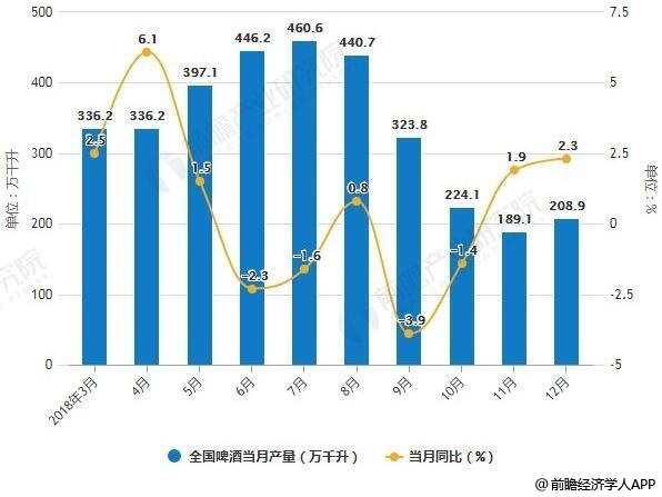 1、回顾2018年,啤酒行业的发展可以概括为:产销放缓,行业还未完全复苏。据前瞻产业研究院发布的《中国啤酒行业品牌竞争与消费需求投资预测分析报告》统计数据显示,2018年1-3季度全国啤酒产量逐渐增长,2018年3季度全国啤酒产量相比1季度增长321.2万千升,增长35.53%。2018年12月全国啤酒产量为208.9万千升,同比增长2.3%。2018年1-12月全国啤酒产量为3812.2万千升,同比增长0.5%。
