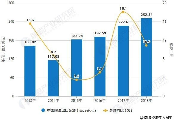 在出口金额方面,2013年-2017年中国啤酒出口金额逐渐增长,2017年中国啤酒出口金额为227.6百万美元,同比增长18.1%。2018年12月中国啤酒出口金额为21.11百万美元,同比下降0.4%。2018年1-12月中国啤酒出口金额为252.34百万美元,同比增长10.9%。