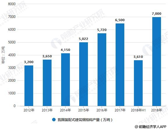 据统计,我国装配式建筑钢结构产量呈逐年增长趋势,由2012年的3200万吨增长到2017年的6500万吨,年均复合增长率达到15%,截止至2018年上半年我国装配式建筑钢结构产量产量为3610万吨。预计2018年钢结构产量将超过7000万吨。