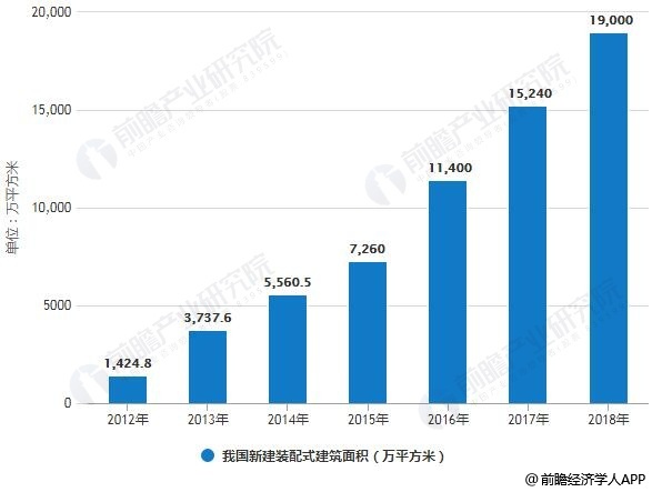 近年来,随着经济的快速发展,预制构件加工精度与质量、装配式建筑施工技术和管理水平的提高以及国家政策因素的推动,预制装配式建筑重新升温,并呈现快速发展的态势。据前瞻产业研究院发布的《中国装配式建筑行业战略规划和企业战略咨询报告》统计数据显示,从2013年开始,我国装配式建筑新建面积呈快速增长趋势,尤其是在2013年,国内新建装配式建筑面积3738万平方米,较2012年同比增长162.32%,行业发展到2017年,新建装配式建筑面积已经达到15240万平方米,随着我国建筑工业化程度的进一步提高,装配式建筑行业将会继续呈良好发展态势,预计到2018年底我国新建装配式建筑面积将达到19000万平方米。