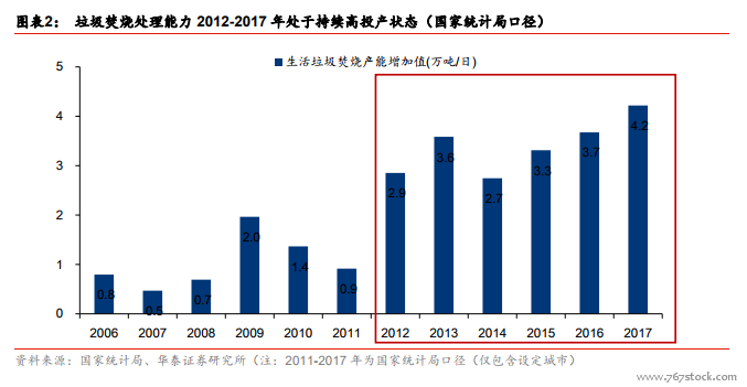 截至 2018 年 6 月,我国已投运垃圾焚烧发电产能为 38.2 万吨/日,预计 19-20 年年均新增投产产能为 8.3 万吨/日,仍处于投产高峰。18 年上半年新增产能为 3 万吨/日,由于下半年一般为垃圾焚烧项目竣工的高峰阶段,我们预计 2018 年全年新增垃圾焚烧产能也将超过 7 万吨/日。中性假设下,18 年新增投运产能与 17 年持平为 7.4 万吨/日,则截至 18年底已投运垃圾焚烧产能将达到 42.5 万吨/日,保守假设“十三五”规划 2020 目标 59.1万吨/日的垃圾焚烧处理能顺利实现,则预计 19-20 年年均新增投产产能为 8.3 万吨/日,则2019/2020 已 投 运 产 能 为 50.8/59.1 万 吨 / 日 , 2017-2020 年 已投运产能增速为27%/21%/19%/16%,增速虽有下滑仍处于投产高峰。