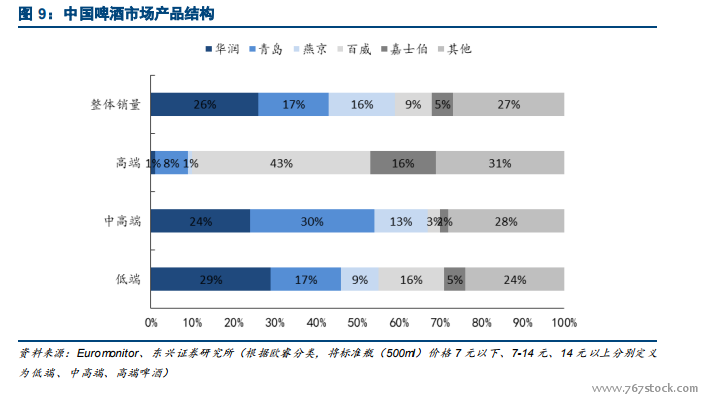 国内啤酒的终端价格与国际市场有较大差距,毛利率较低。国外市场吨酒价基本在4000 元以上,以百威英博为例,2017 年公司全球吨酒价为 910 美元,而在亚太地区吨酒价为 679 美元。相比较,国内酒企吨酒价基本在 3000 元水位下。可以看出国外吨酒价远高于国内啤酒巨头。而较低的吨酒价也导致毛利率处于低位。百威 2017 年毛利率达到 62.4%,而国内毛利率最高的青岛啤酒也仅有 39.25%,市占率最高的华润啤酒由于低端啤酒占比较大,所以毛利率仅有 36%。