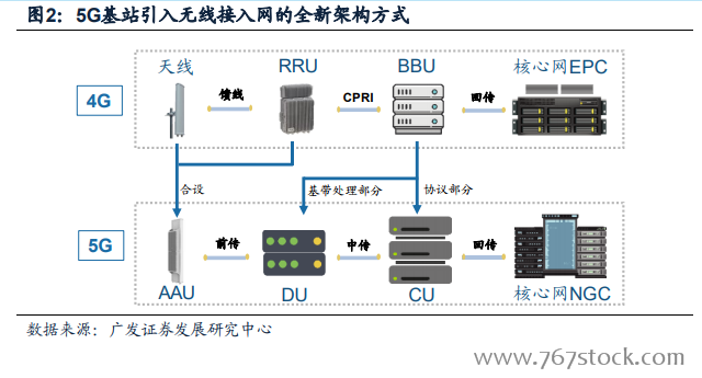 5G基站将天馈系统和RRU一体化集成AAU,引入AAU+CU+DU的全新接入网架构。5G时代3GPP提出基站的重构方案,将以往4G基站由天馈系统、RRU(射频拉远单元)、BBU(基带处理单元)组成的网络结构,升级为5G基站全新的AAU+CU+DU架构。