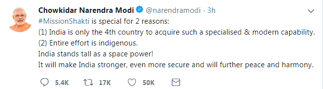 莫迪用“印度的光辉时刻”来形容这次壮举。他还在演讲中提到,“‘Shakti Mission’行动由印度国防研究与发展组织(DRDO)领导,旨在加强印度的整体安全。该行动并不针对任何国家,也没有违反任何国际条约。这项罕见的成就有利于帮助印度加入由俄罗斯、美国和中国组成的超级大国梯队”。