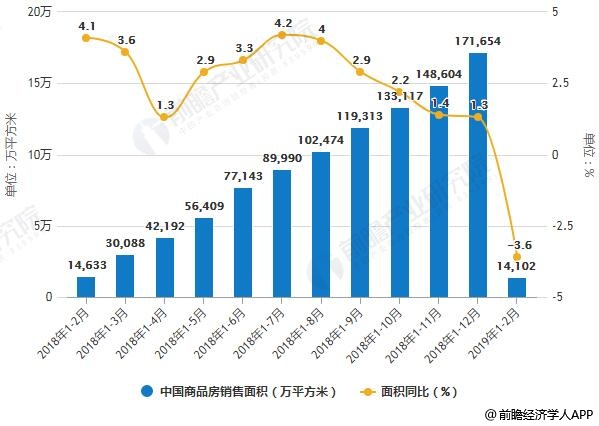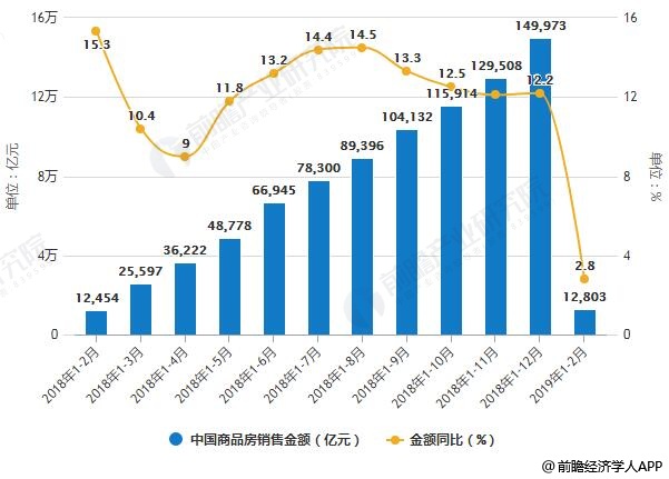 据前瞻产业研究院发布的《中国房地产行业市场需求预测与投资战略规划分析报告》统计数据显示,2019年1-2月份,中国商品房销售面积14102万平方米,同比下降3.6%,2018年全年为增长1.3%。其中,住宅销售面积下降3.2%,办公楼销售面积下降15.7%,商业营业用房销售面积下降13.6%。——商品房销售额12803亿元,增长2.8%,增速回落9.4个百分点。其中,住宅销售额增长4.5%,办公楼销售额下降6.2%,商业营业用房销售额下降9.4%。