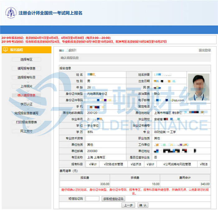 8.确认填报信息。对自己填写的报名信息进行确认,发现有填写错误的地方点击【上一步】按钮返回进行修改,保证报名信息准确无误。确认时需要输入系统发送的短信验证。