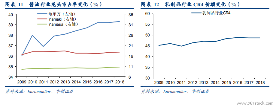 成熟市场中竞争格局相对稳定,龙头抢占市场份额。譬如在酱油行业中,龙头龟甲万市占率从 2009 年 36.0%提升到2018 年的 39.3%,而第二、第三名市占率保持相对稳定;在乳制品行业中,CR4 份额从 45.3%提升至 48.7%;在豆奶行业中,龟甲万市占率从 2010 年的 40.6%提升到 2018 年的 47.6%,而第二、第三名市占率皆有下滑;在薯片行业中,卡乐 B 市占率从 2009 年的 38.2%提升至 2018 年的 45.7%,而第二、第三名份额皆有下滑。