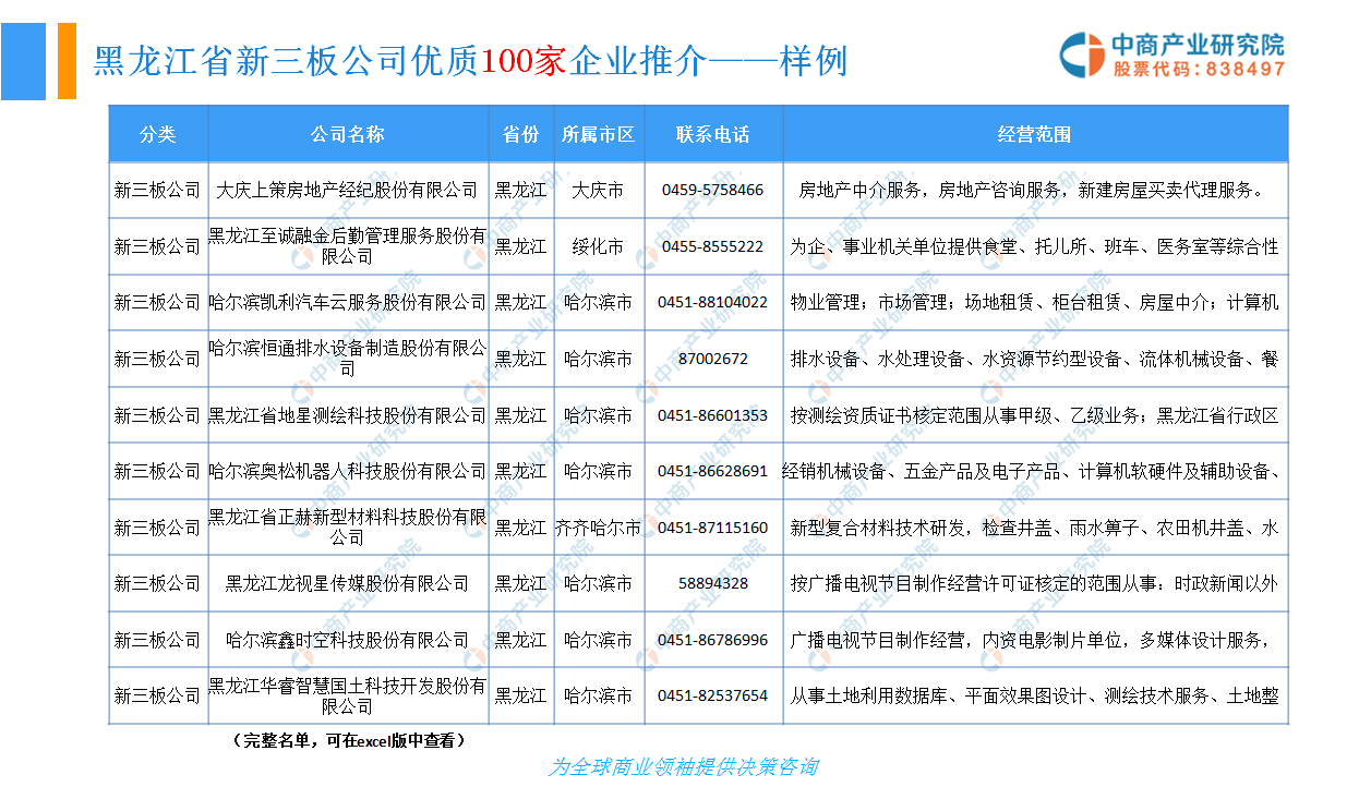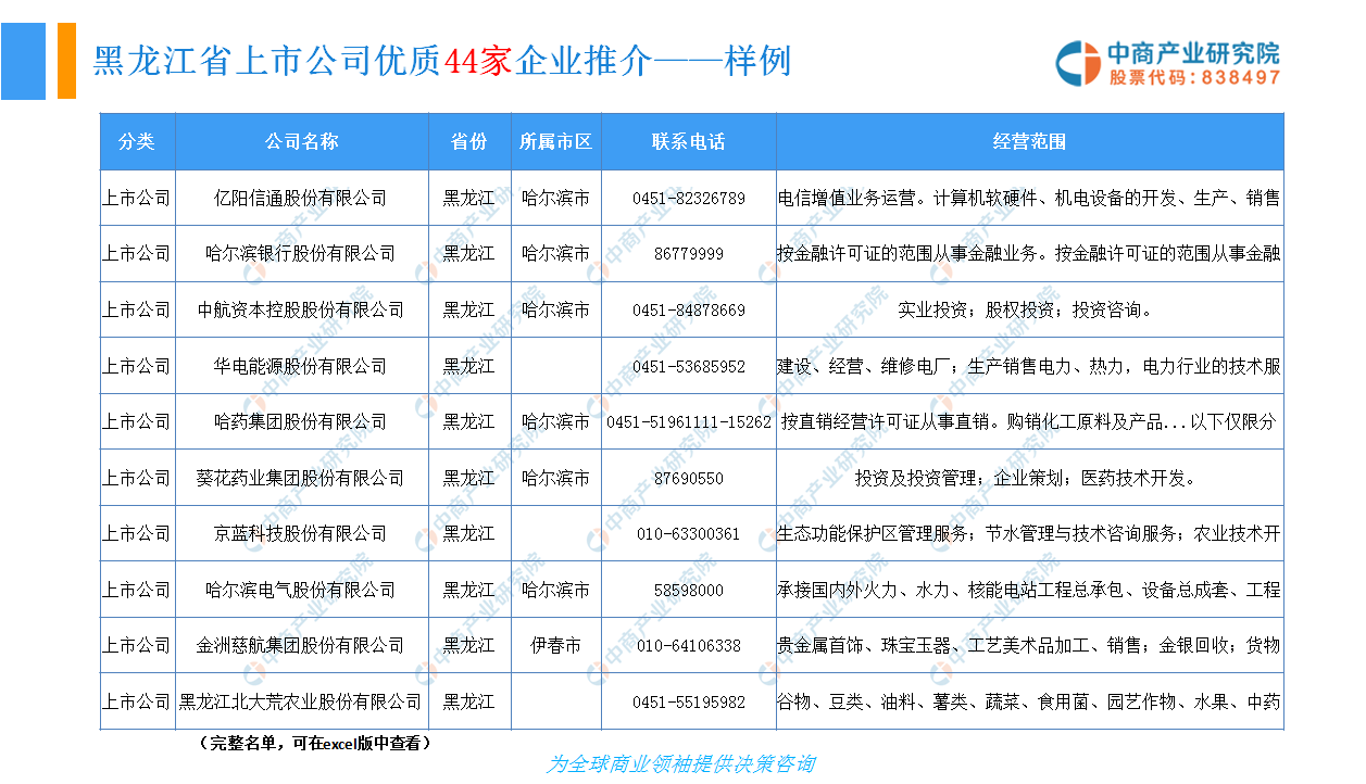 2、黑龙江上市公司44家、新三板100家企业经营数据、联系方式及经营范围。