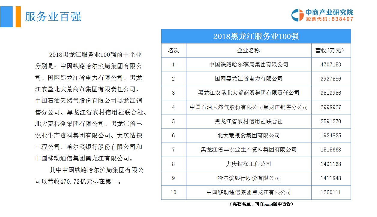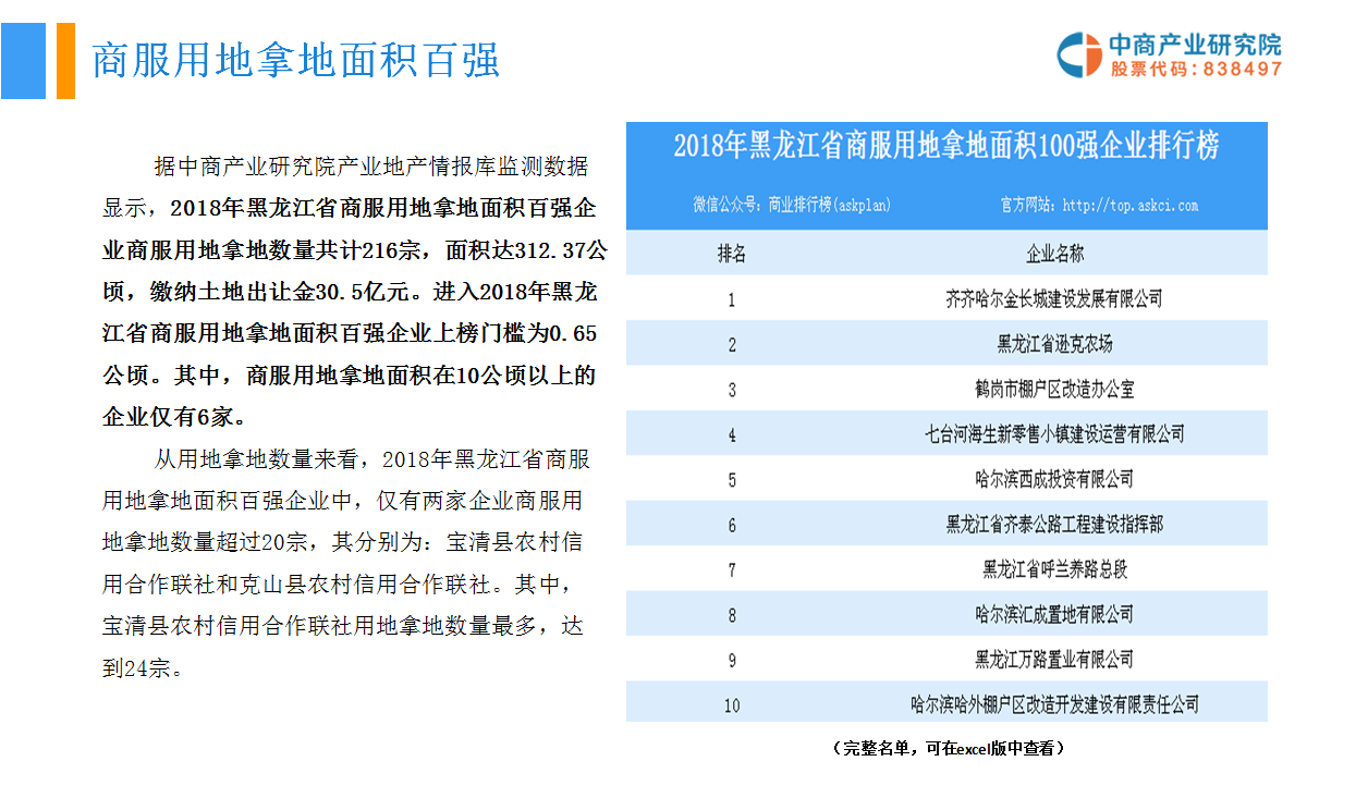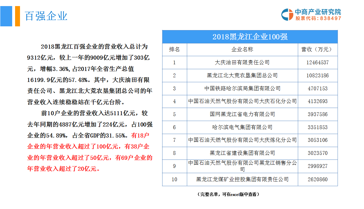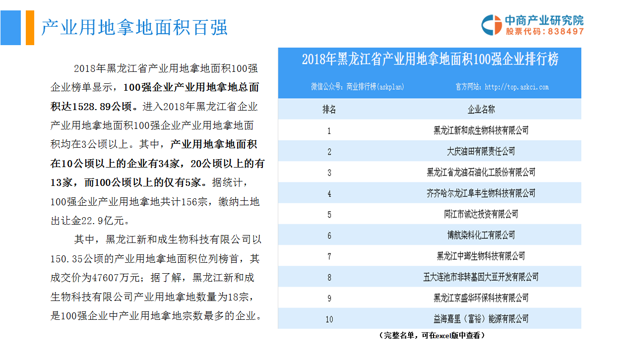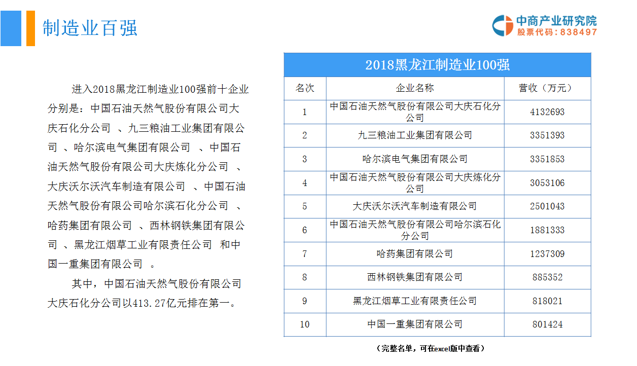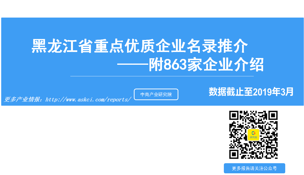 完整版报告请点击下载《2019版黑龙江省重点优质企业名录推介(附863家企业介绍)》,下载地址为:http://www.askci.com/reports/20190404/0859478868860917.shtml