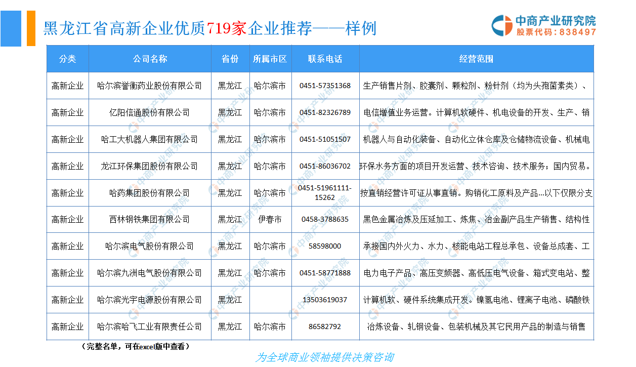 3、黑龙江最新最全高新企业719家联系方式、经营范围。