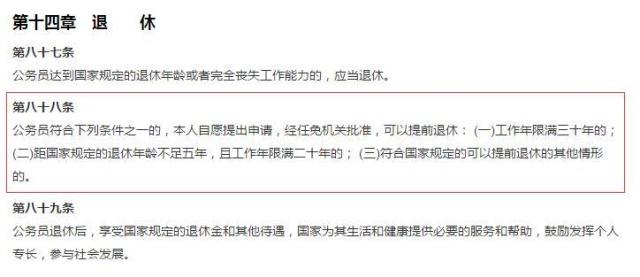这几天网上有不少文章中说其中对于提前退休做出了新规定。其实,这并不是一条新的规定,中华人民共和国公务员法(2017修正)中就有相关的内容。