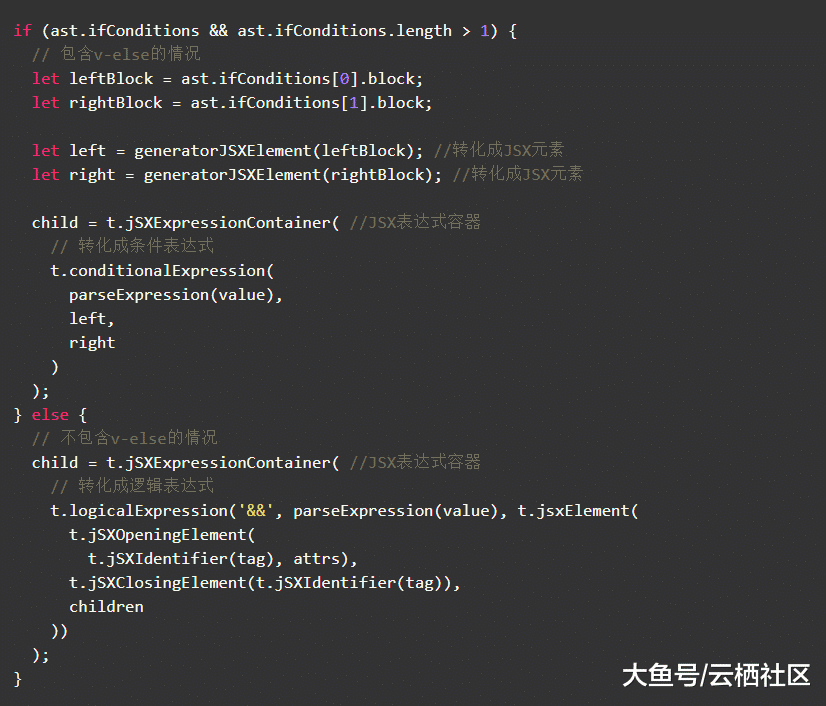 转化为{ xxx ?: }经过vue-template-compiler解析后的template AST值里会包含ifConditions属性值,如果ifConditions的长度大于1,表明存在v-else,具体处理的逻辑如下: