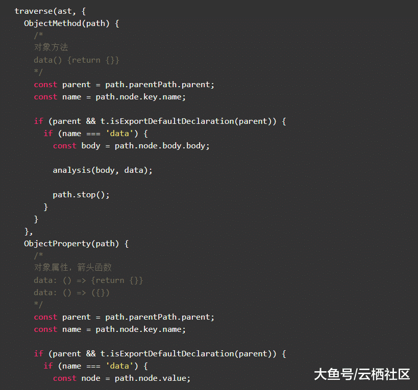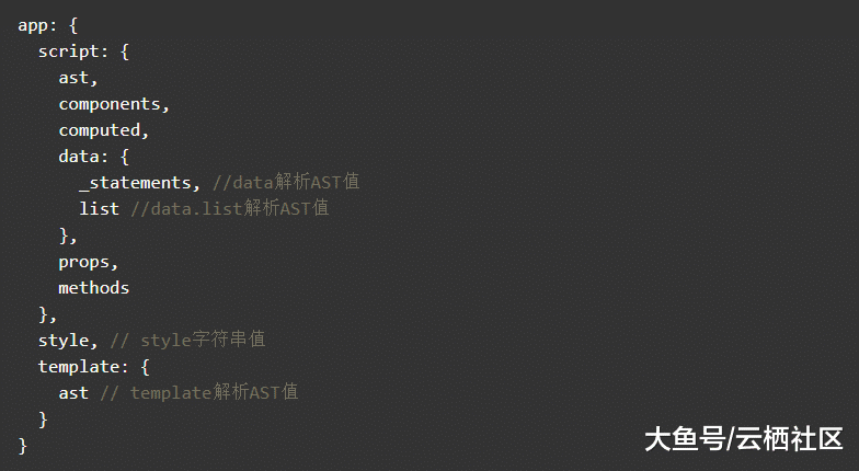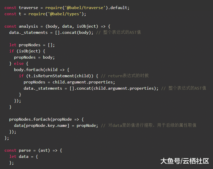 我们需要先解析Vue代码变成AST值。这里使用了Vue官方的vue-template-compiler来分别提取Vue组件代码里的template、style、script,考虑其他DSL的通用性后续可以迁移到更加适用的html解析模块,例如parse5等。通过require('vue-template-compiler').parseComponent得到了分离的template、style、script。style不用额外解析成AST了,可以直接用于React代码。template可以通过require('vue-template-compiler').compile转化为AST值。script用@babel/parser来处理,对于script的解析不仅仅需要获得整个script的AST值,还需要分别将data、props、computed、components、methods等参数提取出来,以便后面在转化的时候区分具体属于哪个属性。以data的处理为例: