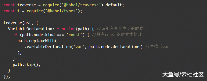 Babel提供了@babel/traverse对解析后的AST进行处理。@babel/traverse能够接收AST以及visitor两个参数,AST是上一步parse得到的抽象语法树,visitor提供访问不同节点的能力,当遍历到一个匹配的节点时,能够调用具体方法对于节点进行处理。@babel/types用于定义AST节点,在visitor里做节点处理的时候用于替换等操作。在这个例子中,我们遍历上一步得到的AST,在匹配到变量声明(VariableDeclaration)的时候判断是否const操作时进行替换成var。t.variableDeclaration(kind, declarations)接收两个参数kind和declarations,这里kind设为var,将const a = 1解析得到的AST里的declarations直接设置给declarations。