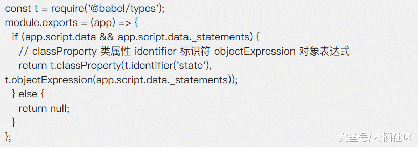 script AST值的转化不一一说明,思路基本都一致,这里主要针对Vue data继续说明如何转化成React state,最终解析Vue data得到的是{_statements: AST}这样的一个结构,转化的时候只需要执行如下代码