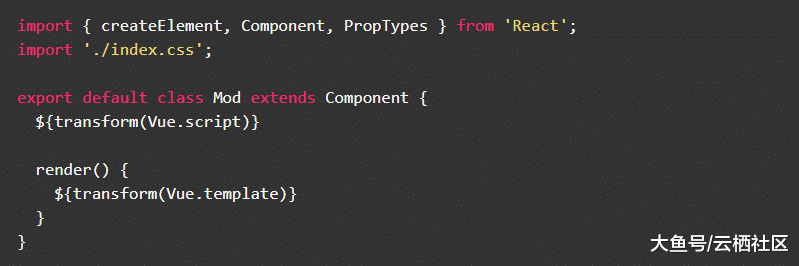 最终转化的React代码会包含两个文件(css和js文件)。用style字符串直接生成index.css文件,index.js文件结构如下图,transform指将Vue AST值转化成React代码的伪函数。