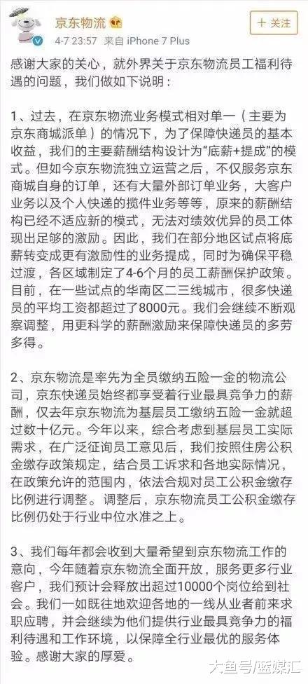 2018年2月,刘强东就发了个微头条:刚刚看了一下去年各种数字!去年为兄弟们缴纳了60亿的保险和公积金!缴纳的税收更多!!我们坚持全员全额缴纳五险一金!如果通过劳务外包或者少缴,一年至少可以多赚50亿人民币!